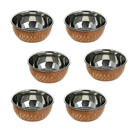 -. Binding : Kitchen -. Brand : RoyaltyRoute -. Color : Brown -. EAN : 8904203714042 -. Feature : Set of 6 Copper serving bowls katoris for Indian food / Each Bowl Dimension:- Height: 1.5 Inches, Diameter: 3.5 Inches, Weight: 150 grams / Serving bowl with hammered copper exterior and durable stainless steel interior / Stainless steel surface preserves the taste and nutritional qualities of foods and is safe for food contact / An essential tableware to present Indian traditional food for Authentic Indian Dining Experience -. Label : RoyaltyRoute -. Manufacturer : RoyaltyRoute -. Model : tableware_bowl006 -. MPN : tableware_bowl006 -. NumberOfItems : 6 -. PackageQuantity : 6 -. PartNumber : tableware_bowl006 -. ProductGroup : Kitchen -. ProductTypeName : HOME -. Publisher : RoyaltyRoute -. Studio : RoyaltyRoute -. Title : Small Ice Cream Party Dessert Bowls, Set of 6