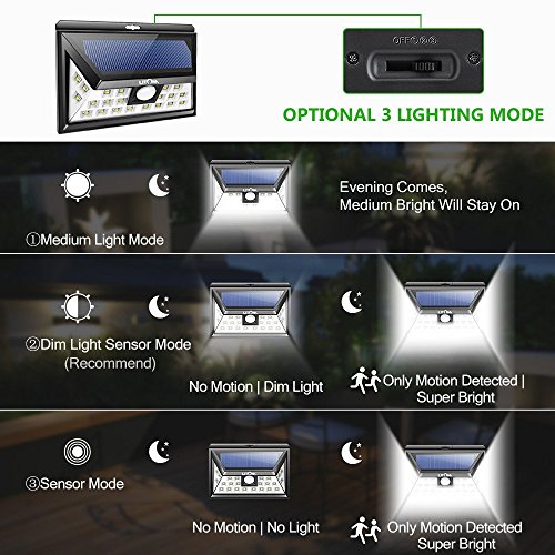 - THREE OPTIONAL MODES: Choose the perfect mode according to your diverse needs. Full-on Mode suits for the front door, back door, outdoor patio, deck area backyard and etc. Reduced Light Mode suits for balcony railing, side and back yard, entryway and etc; Motion Detected Mode suits for garage, driveway, path, fence and etc