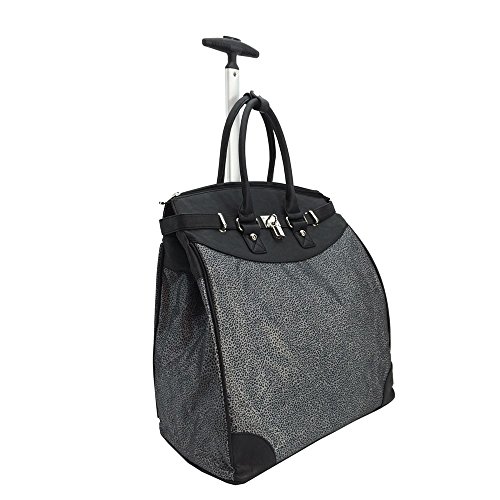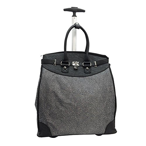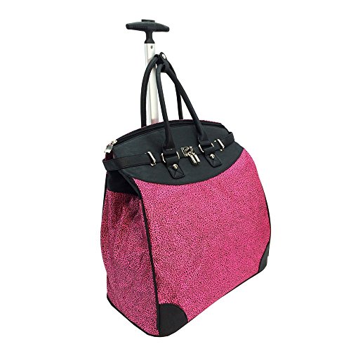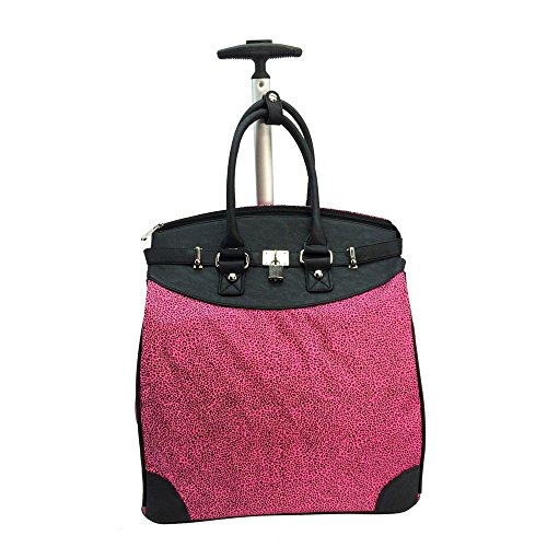 Studio : ALFA Travelgear Inc. Publisher : ALFA Travelgear Inc. Product Description Make travel easy with this Rollies Mirco Leopard Rolling 14-inch Laptop Travel Tote featuring a leopard print available in black and pink. This tote comes with a lightweight, retractable handle bar and two rollie wheels for convenience. protective feet and padded top handles protect the bag, making it last trip after trip. Carry your tablet or laptop with you when you travel in the 14-inch compartment.Zipper compartment rolling toteTSA and airline friendlyTablet and 14-inch laptop compartmentStrong Rollies wheels - custom designSuper lightweight handle barDIY monogram and lock engraving friendlyFoldable storageSize: 16 inches high x 19 inches wide x 9 inches deepShoulder handle drop: 7 inchesWeight: 5 pounds Type: Business, Fashion, Drawstring, Softsided, Tablet, Foldable, Hybrid, Laptop, Laptop Sleeve, Lightweight, Multi Compartment, Rolling, Utility, ZipperedProduct Features: Eco-FriendlyMaterial: Microfiber, Polyester, Aluminum, Canvas, Synthetic LeatherPattern: LeopardExterior Pocket: 1Interior Pocket: 2Feature: Checkpoint-Friendly, Expandable, Foldable, Multi-CompartmentExact Color: Black, PinkColor: Black, Pink WARNING: Attention California residents: This product may contain chemicals known to the State of California to cause cancer. www.P65Warnings.ca.gov 0