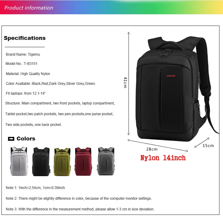 NOTE 1 :T-B3151 backpack 14inch is Nylon material,Laptop compartment size :24*35cm