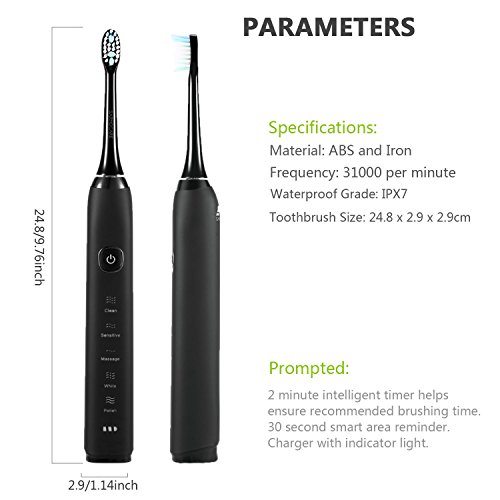 Built in Li-iron battery, it can be used for up to 30 days long when fully charged. 2 minutes auto-timer, full direction clean your teeth,easy start function,IPX7 protection