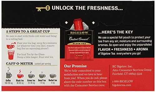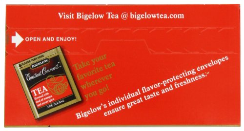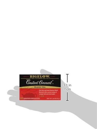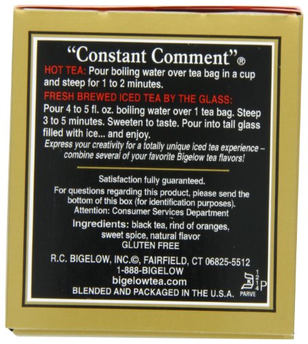 -. Binding : Grocery -. Brand : Bigelow Tea -. EAN : 0072310001053 -. Feature : Pack of six 20-count boxes of calorie-free tea (120 total tea bags) / Hand-picked black tea flavored with orange rinds and sweet spice / Gluten free, with no calories and no carbohydrates; Kosher Parve / An excellent source of healthy antioxidants / Ships in Certified Frustration-Free Packaging -. IsAdultProduct : 0 -. Label : Bigelow -. LegalDisclaimer : Actual product packaging and materials may contain more and different information than what is shown on our website. We recommend that you do not rely solely on the information presented and that you always read labels, warnings, and directions before using or consuming a product. -. Manufacturer : Bigelow -. Model : 7231000105 -. MPN : 0190314 -. NumberOfItems : 6 -. PackageQuantity : 6 -. PartNumber : 0190314 -. ProductGroup : Grocery -. ProductTypeName : GROCERY -. Publisher : Bigelow -. ReleaseDate : 2006-06-22 -. Size : 6 Pack / 20 Bags -. Studio : Bigelow -. Title : Bigelow Constant Comment Tea, 20-Count Boxes (Pack of 6) -. UPC : 072310001053