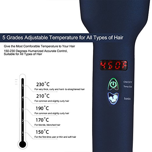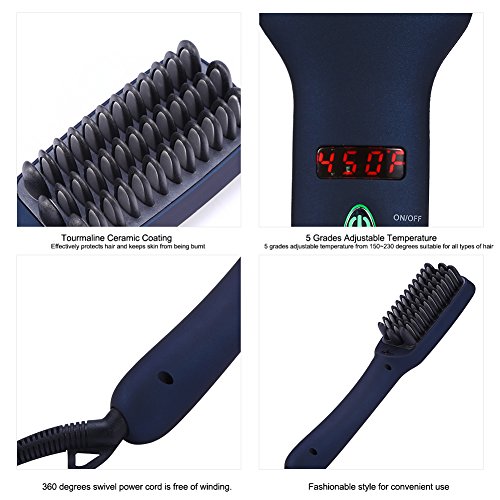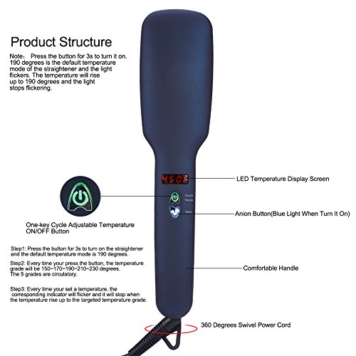 Studio : ZJchao Publisher : ZJchao Binding : Misc. Product Description ZJchao Hair Straightening Brush: ●Please keep your hair dry and clean before using the hair straightener brush. ●Plug the hair straightening brush into a proper socket to keep it well charged. ●Turn it on and adjust the temperature, you can choose what you want. 3 Models for your choice 1.MCH heating: Press the power button for 3 seconds and set the temperature you need. This model is only for straighten the hair with heating. 2. Ionic Brush: Press the Ionic button for 3 seconds. The hair straightening brush with this model can emits negative ions and interact with the molecular particles in your hair. It is super good for your daily hair care! 3.MCH heating Ionic Brush: Press the power button and Ionic button together for 3 seconds. This model will be protecting your hair with plenty of negative ions when straightening the hair. 5 Temperature Control for All Hair Types with this Hair Straightening Brush ?Level 1: 150℃, suitable for fisrt time user or user with thin and fine hair, or bleached hair ?Level 2: 170℃, suitable for dyed or dark colored hair ?Level 3 4: 190℃~210℃, suitable for normal or slightly curly hair ?Level 5: 230℃, suitable for thick and very curly hair, or difficult to style hair Specification: Item Type: Anion Strightening Brush Heating Element: PTC Voltage: 110-240V Frequency: 50/60Hz Power: 30W Color: Black Optional Plugs: US Item Size: Approx. 27 X 7 X 5cm / 10.6 x 2.8 x 2inch Package Size: Approx. 34.5 x 12.5 x 7cm / 13.6 x 4.9 x 2.8inch Package Weight: Approx. 599g