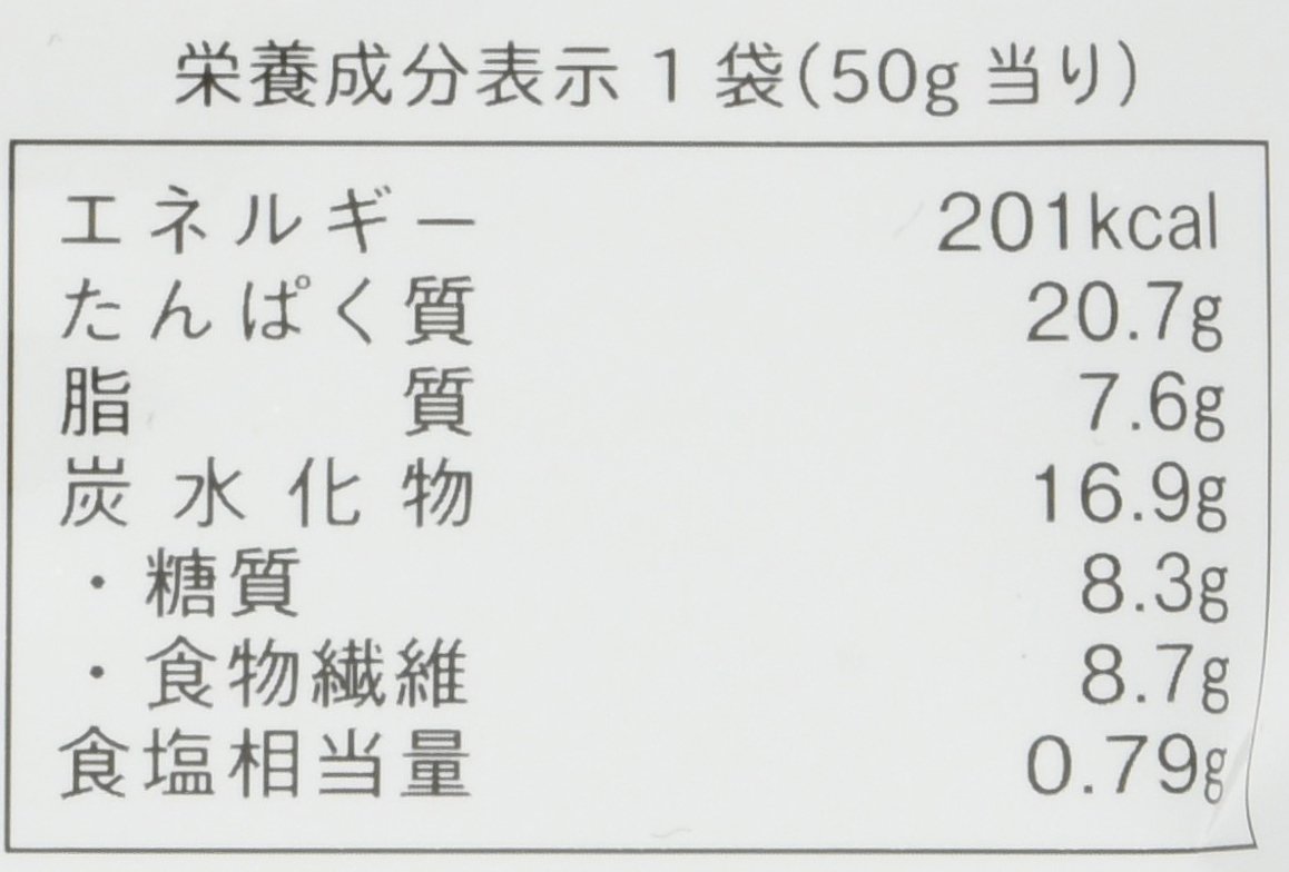 Protein 20.7 g per bag (50 g), lipid 7.6 g, carbohydrate 16.9 g, carbohydrate 8.3 g, dietary fiber 8.7 g, salt equivalent 0.79 g