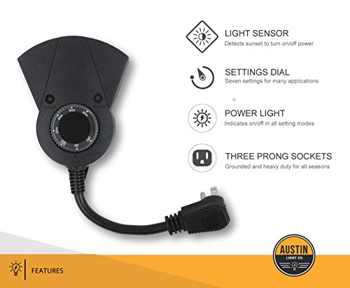 DESIGN - Three integrated grounded three-prong outlets. Features photoelectric and manual timer controls. 6" tail wire. Works with incandescent, LED or CFL lighting. Designed to be used indoor and outdoor in nearly any weather condition. Tough, durable and beautiful!