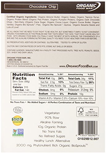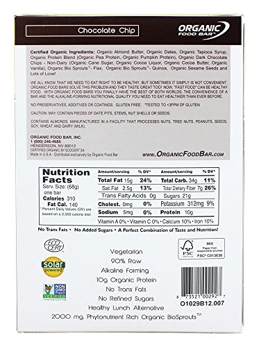 Studio : Organic Food Bar Publisher : Organic Food Bar Binding : Health and Beauty Product Description Legend has it that Albert Einstein was eating chocolate when he came upon the theory of relativity. While chocolate may be good for the mind, we know it’s good for the body. In fact, dark chocolate is one of the most potent antioxidants in nature, with a very high ORAC factor (“Oxygen Radical Absorbance Capacity” is a fancy term for how much a food protects you against free radical damage). Organic Food Bar Chocolate Chip has the same formula as our Vegan Bar, with the added taste and nutritional power of organic, non-dairy, dark chocolate chips. While eating our Organic Food Bar Chocolate Chip may not lead to historic discoveries, it will lead to a healthier body and a better mindset. 0