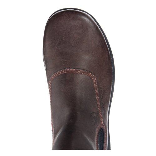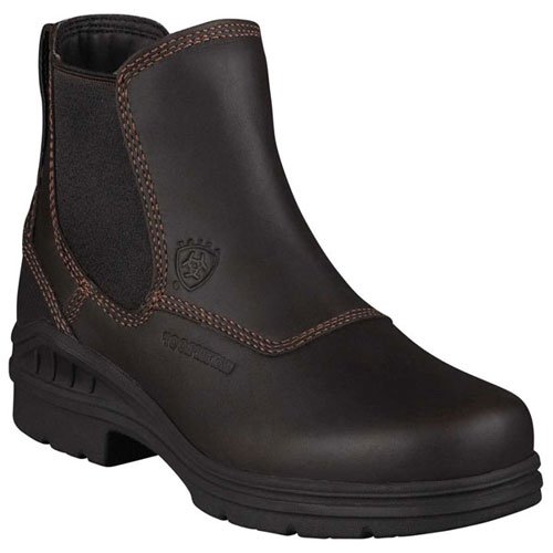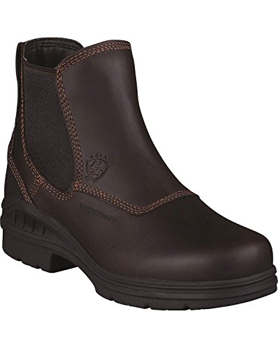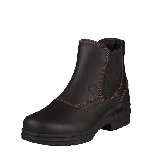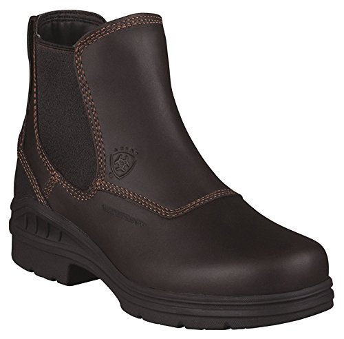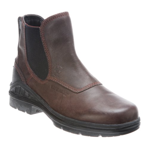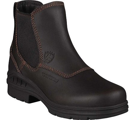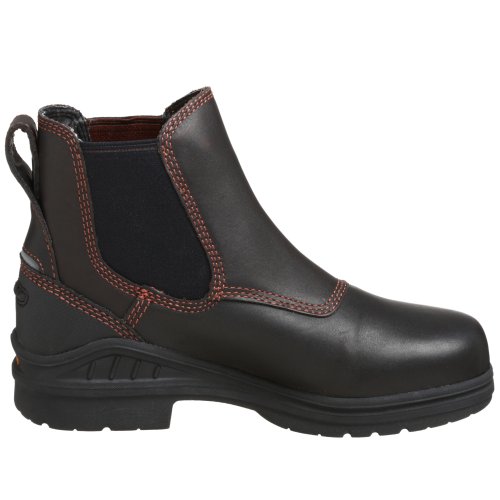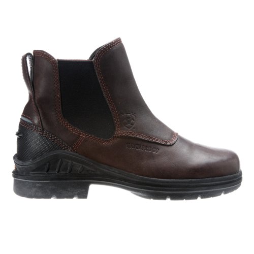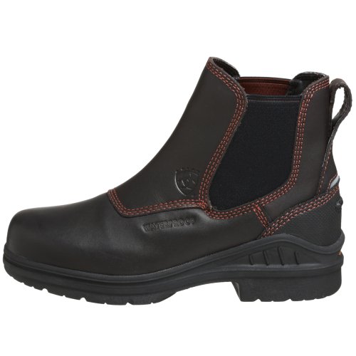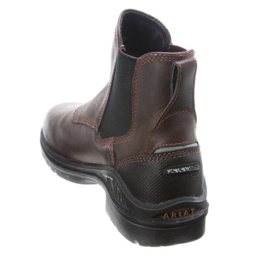 Amazon.com Product Description The sleek Ariat Barn Yard H2O Boot is a practical addition to your footwear arsenal. Featuring a leather upper with detailed stitching, the solidity of a patented composite forked shank, a Carbon rubber Duratread outsole, and an ATS cushioning system for serious comfort, this is a technical low boot with serious good looks. The twin-gore, pull-on design eliminates the hassle of laces and ensures a great fit. 0