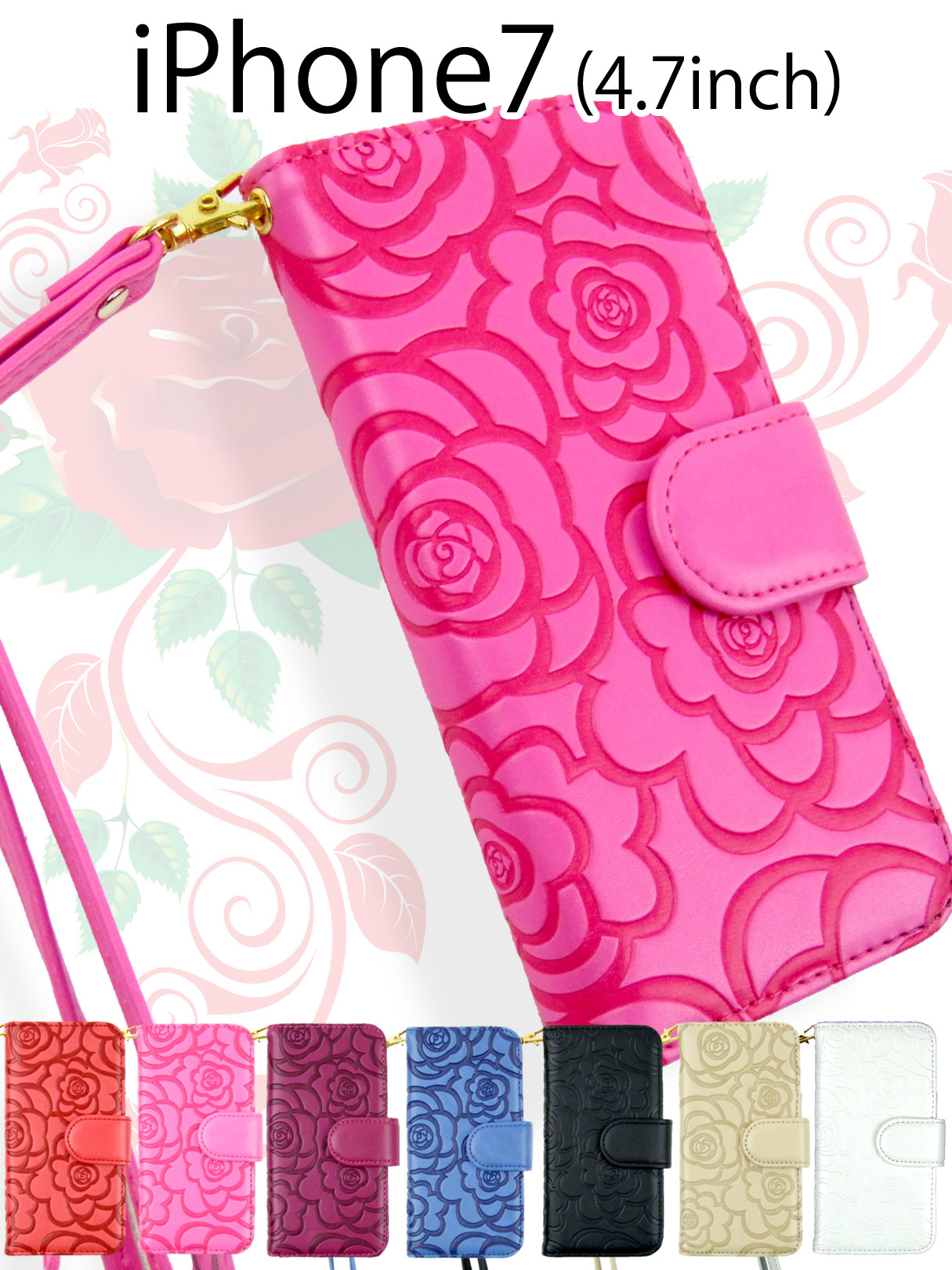 ◆手帳型iPhoneケース◆マットな質感のPUレザー製の二つ折りiPhoneケースです。上品さとキュートさを兼ね備えた花柄型押し。素材の発色も綺麗で高級感があります。シンプルでスマートなシルエットですが、内側にはカードケースやフリーポケットが付けられており、収納性も高く便利な仕様となってます。ストッパーはマグネットで固定できるので誤って開閉してしまうこともありません。 全7色※ご利用のモニター、ディスプレイにより若干色味に差がある場合がございます。ご了承ください。※商品の生産時における装飾等は海外にて手作業で行っており、多少の差異がある場合がございます。ご了承ください。