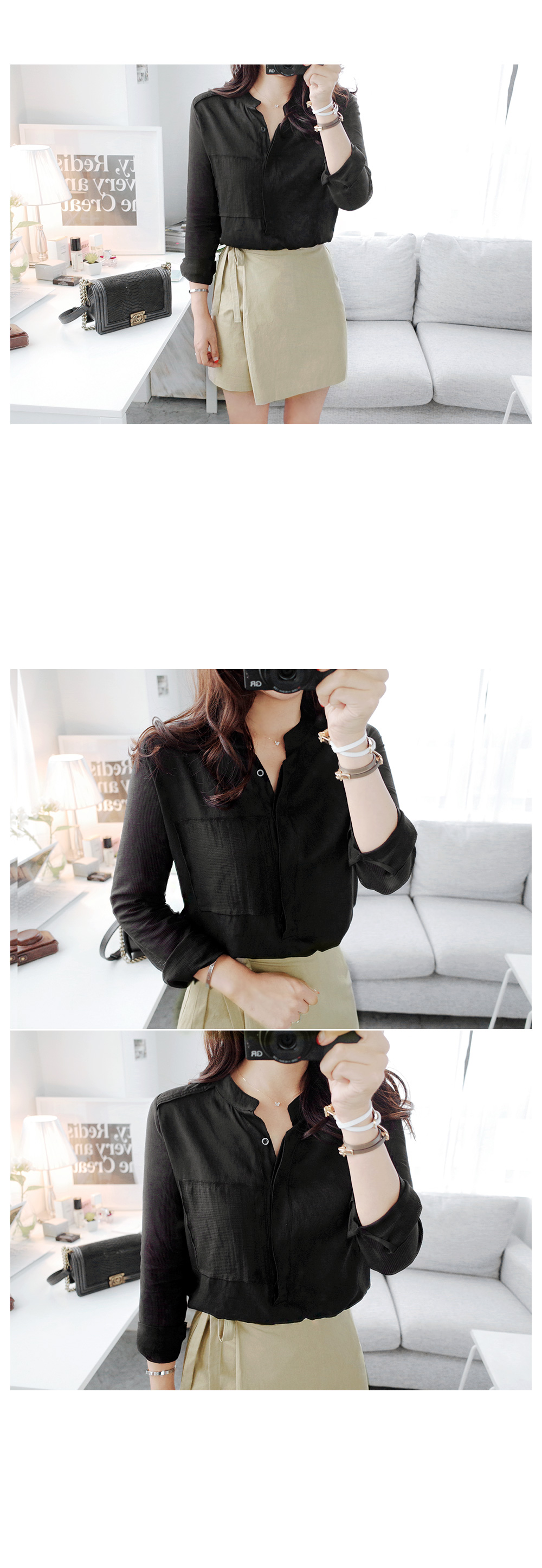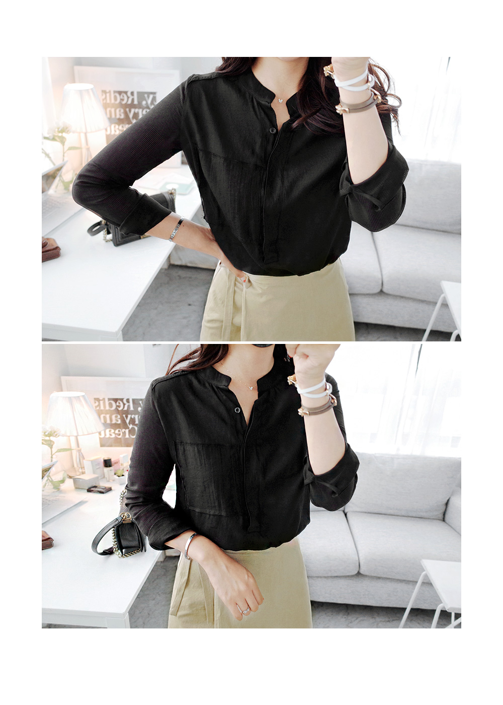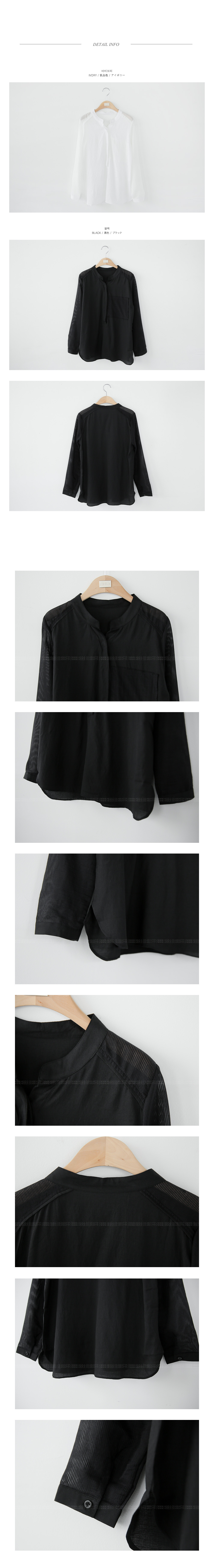 간절기시즌 한 벌쯤은 소장해야 할심플한 디자인의 데일리 블라우스에요^^바디에 부담없는 가벼운 소재감으로간절기시즌 데일리하게 활용 될 아이템이구요,소매는 은은한 스트라이프 패턴이시스루 느낌을 연출해 주는 블라우스랍니다!세련된 헨리넥 디자인이 넥을 감싸주어안정감있는 핏을 잡아주면서 바스트의 페이크 포켓이 포인트되요~군더더기없는 디자인으로 유행에 구애받지 않아매시즌 꺼내입기 좋은 데일리 블라우스에요!