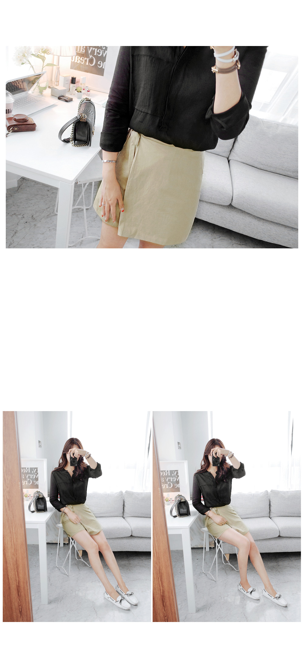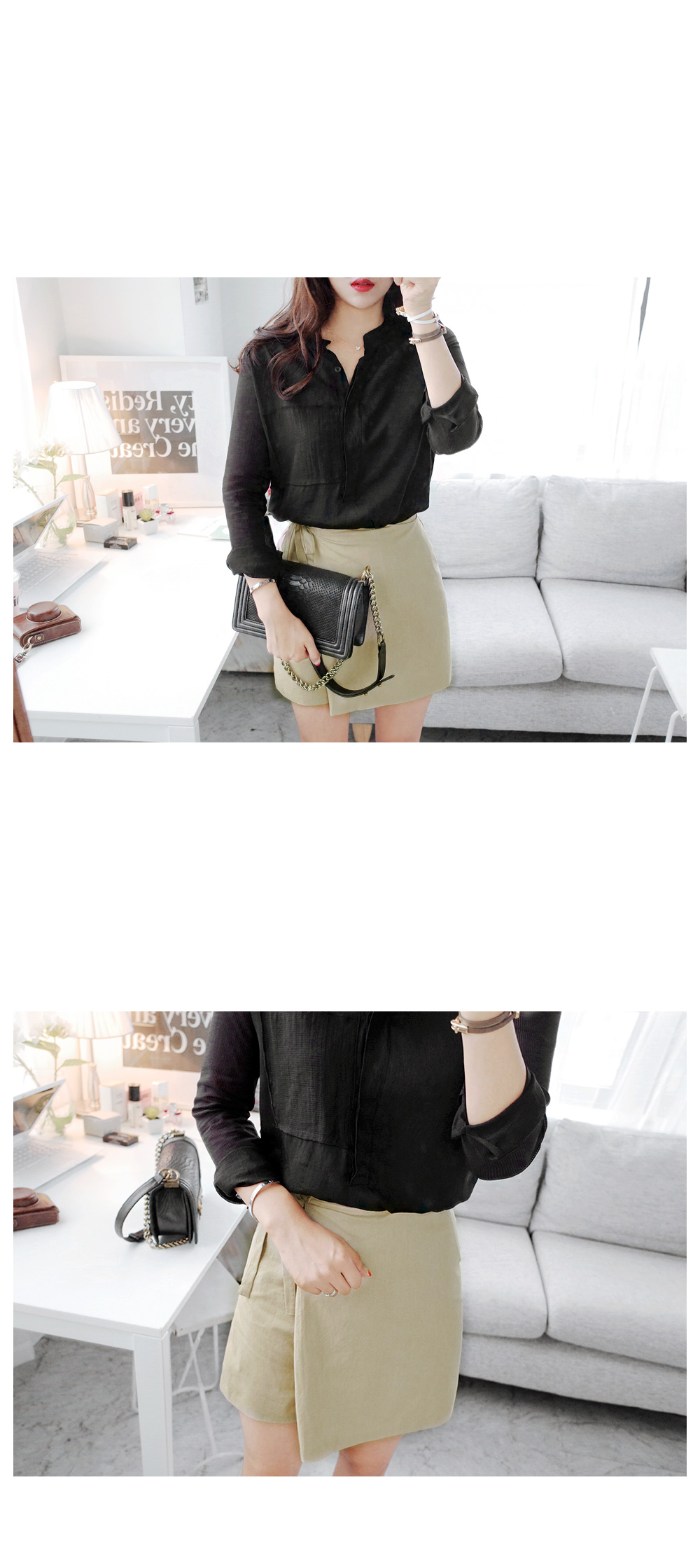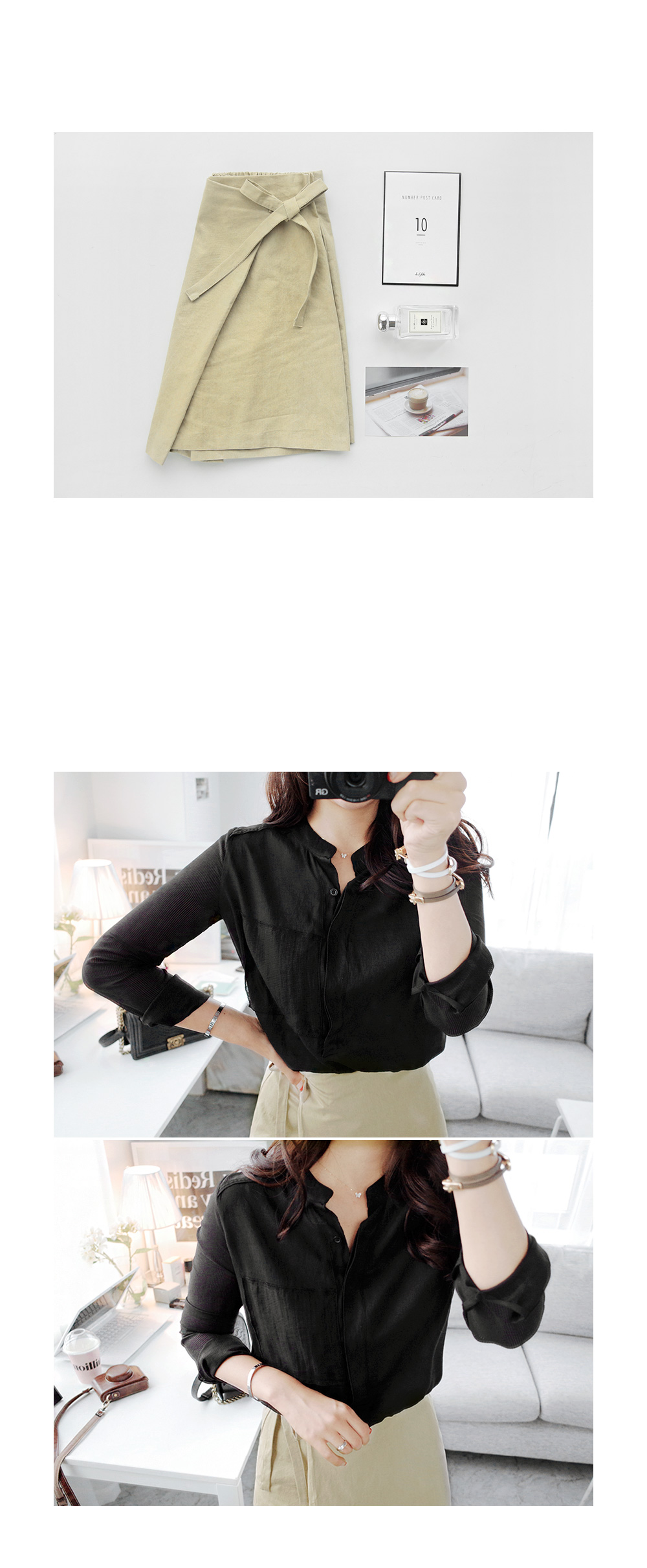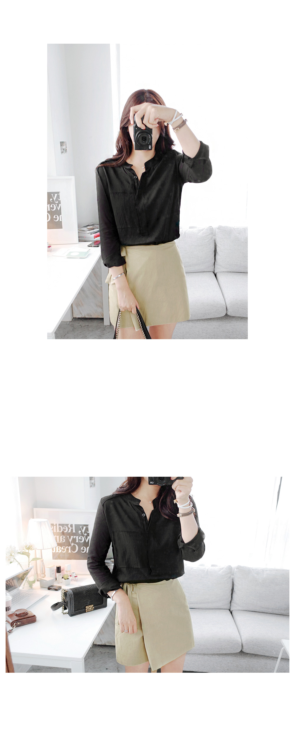 간절기시즌 한 벌쯤은 소장해야 할심플한 디자인의 데일리 블라우스에요^^바디에 부담없는 가벼운 소재감으로간절기시즌 데일리하게 활용 될 아이템이구요,소매는 은은한 스트라이프 패턴이시스루 느낌을 연출해 주는 블라우스랍니다!세련된 헨리넥 디자인이 넥을 감싸주어안정감있는 핏을 잡아주면서 바스트의 페이크 포켓이 포인트되요~군더더기없는 디자인으로 유행에 구애받지 않아매시즌 꺼내입기 좋은 데일리 블라우스에요!