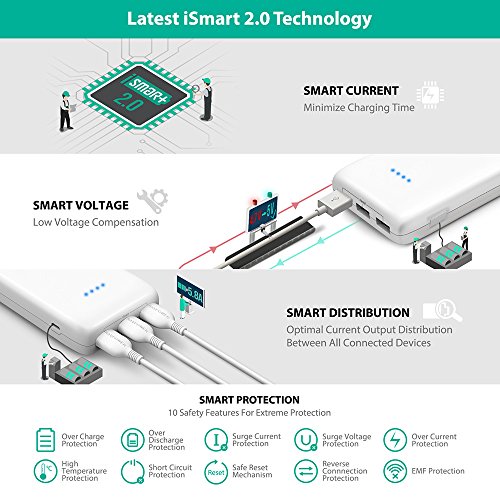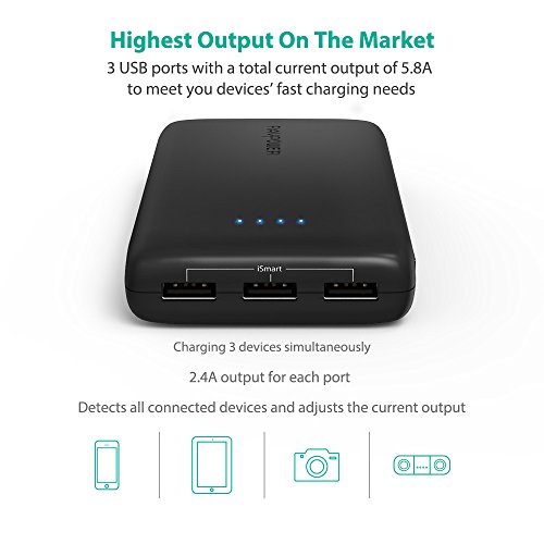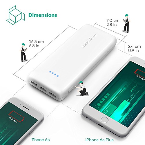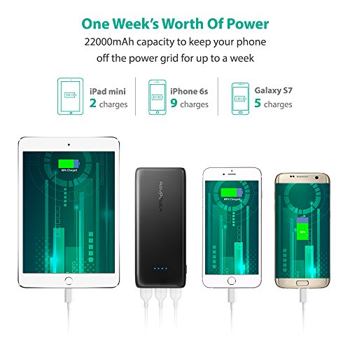 -. Binding : Wireless Phone Accessory -. Brand : RAVPower -. Feature : HIGHEST OUTPUT FOR 3 CHARGING DEVICES: 3 USB ports for a total current output of 5.8A (2.4A max per port). Charge two iPads and one iPhone 6s at once at their optimal charging speed with the iSmart 2.0 technology. / WEEKLONG 22000mAh: Charge your iPhone 6s up to 9 times, a Galaxy S7 up to 5 times, or an iPad Mini more than 3 times with a massive 22000mAh capacity. Save up to 60% of charging time thanks to its 5V / 2.4A input. / POWER EFFICIENT BATTERY Invest in a high-density Li-polymer battery that retains 70-80% of its capacity after 500 charge cycles. It's the daily choice of Microsoft, Lenovo, Huawei, and Motorola. / NEW & IMPROVED iSMART 2.0: The new and improved iSmart 2.0 adjusts current and voltage to minimize charging time. Whereas, Panasonic Smart IC frequency technology provides a safer and higher current conversion. / EXCELLENT QUALITY IN & OUT: On the outside, a UL94 V-0 fire-resistant shell used by Mercedes-Benz, BMW, and others for their luxury cars. On the inside, the same battery and the same quality control as the iPhone. WHAT¡¯S IN THE BOX: RAVPower Ace Series 22000mAh External Battery Pack, Micro-USB Charging Cables (X2), Carry Pouch, User Guide and ? LIFETIME Warranty Card ? -. Label : RAVPower -. Manufacturer : RAVPower -. PackageQuantity : 1 -. ProductGroup : Wireless -. ProductTypeName : WIRELESS_ACCESSORY -. Publisher : RAVPower -. Studio : RAVPower -. Title : RAVPower 22000 External Battery