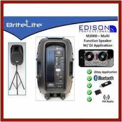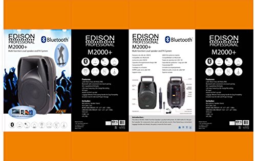 -. Binding : Electronics -. Brand : Edison Professional -. EAN : 0636123235854 -. Feature : 500 RMS, 2000 watts peak power / USB charging -for mobile devices & more / One button Bluetooth pairing / Built in FM radio and live record function / Wireless microphone, XLR cables and tripod included -. IsEligibleForTradeIn : 1 -. Label : Edison Professional -. Manufacturer : Edison Professional -. Model : M-2000 Plus -. MPN : M-2000 Plus -. NumberOfItems : 1 -. PackageQuantity : 1 -. PartNumber : M-2000 Plus -. ProductGroup : CE -. ProductTypeName : PORTABLE_AUDIO -. Publisher : Edison Professional -. Studio : Edison Professional -. Title : Edison Professional M-2000 Plus 15" High Power PA Speaker -. UPC : 636123235854