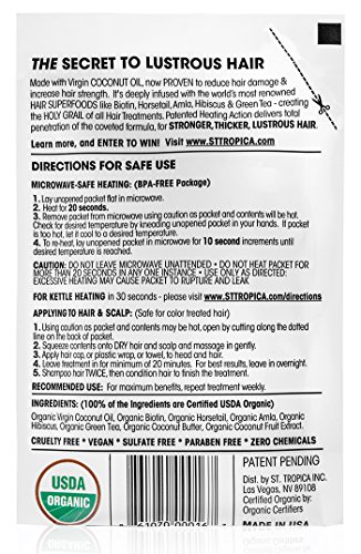 A potent, organic way to totally transform your hair If you have fine, fragile hair, use a lot of color or suffer from split ends and frizzy hair, you already know how hard it can be to find a solution that WORKS! Well, now you're in luck because we've designed a totally unique powerhouse formula of raw & unrefined hair super food ingredients that combine with the heat of a hot oil treatment to give you hair results like no other mask on the market! The secret to fuller, glossier, healthier hair We use certified organic, raw, unrefined, and cold pressed coconut oil in combination with the most time-tested and powerful hair 'superfoods' like organic biotin, amla, horsetail, green tea, and hibiscus. These ingredients have been proven time and again reduce frizz and split ends while nourishing, repairing and promoting hair growth that is extra thick, strong and lustrous. Then the whole thing is tied together with our unique patented heating action that delivers fast penetration of the entire formula giving you unprecedented results! And of course, we only use the very best natural ingredients - no harsh chemicals We don't like using nasty chemicals on our hair and we don't like animal testing either. That's why our hair masks are USDA organic & vegan certified and 100% free of chemicals, sulfates, gluten and parabens. Plus, we have the highest possible score on the Skin Deep® cosmetic database (#1 out of 10), so you know your hair will be getting the very best! And there's zero risk when you buy today At St. Tropica we want you to have the best customer experience possible when buying with us, which is why we cover you with a 30-day, no-questions-asked money back guarantee. So, with nothing to lose, click add to cart now! and get ready for thicker, fuller, healthier hair!Feature