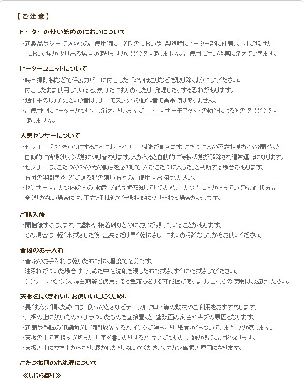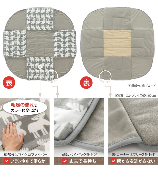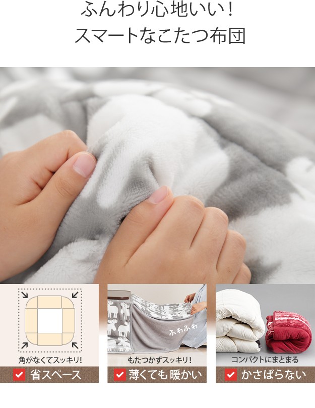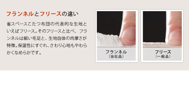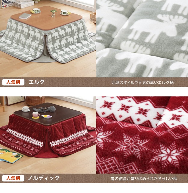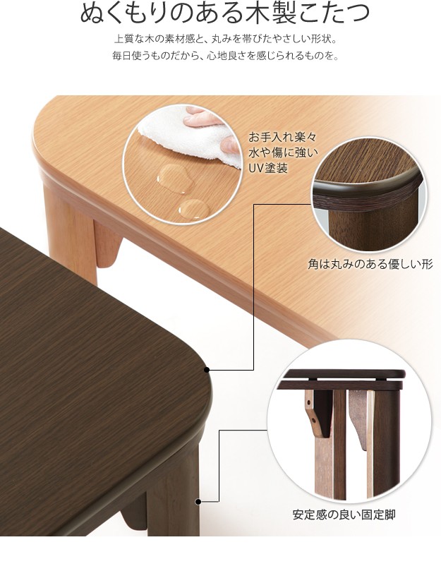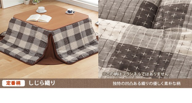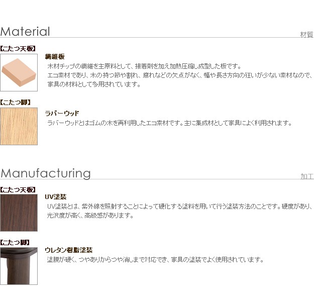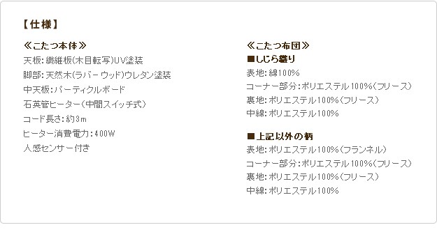 材質:こたつ天板-繊維板・UV塗装(木目転写)、こたつ脚部-天然木(ラバーウッド)・ウレタン塗装、布団表地-ポリエステル100%(フランネル)、しじら織り/綿100%、布団コーナー・裏地-ポリエステル100%(フリース)、中綿-ポリエステル100%、天板裏地-ポリエステル80%・綿20%