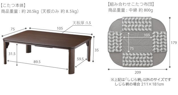 サイズ:こたつ-幅105x奥行75x高さ35cm・約20.5kg、布団-211x181cm・中綿量0.8kg
