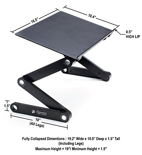 -. Feature : LIGHT WEIGHT, HIGH STRENGTH ALUMINUM TRAY - Makes Carrying Easy and Holds Your Computer Firm and Steady. / LOCK IN PLACE HINGES - Click In to Place Every 15 Degrees - Just Push the Button, Rotate the Leg, and It Snaps Into Place / FULLY ADJUSTABLE LEGS - Rotate 360 Degrees and Lock in Place at Various Angles. Quickly Collapse The Stand to Make it Portable. / MULTIPLE USES - Table Can Also Be Used For a TV Dinner Tray, Sound Equipment, Projector, Standing Desk, Book Tray, Writing Desk, and Tablet Holder. / MONEY BACK GUARANTEE - If You Do Not Like It or Don't Want It For Any Reason, We Will Happily Accept The Return and Give You Your Money Back. No Questions Asked.