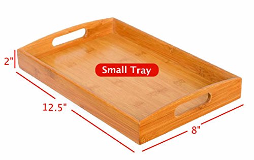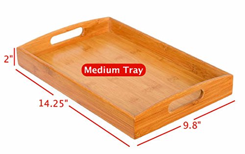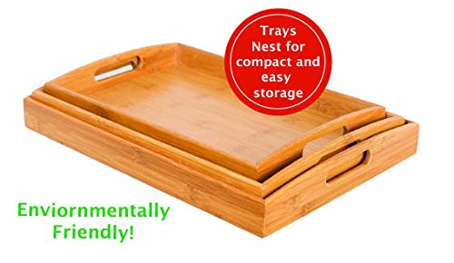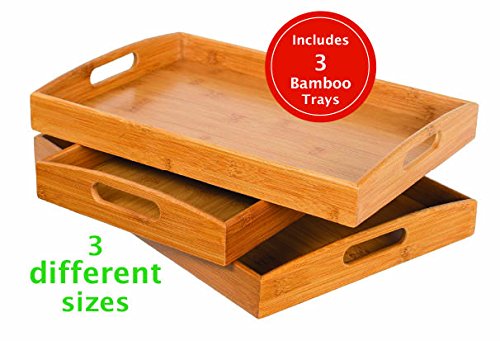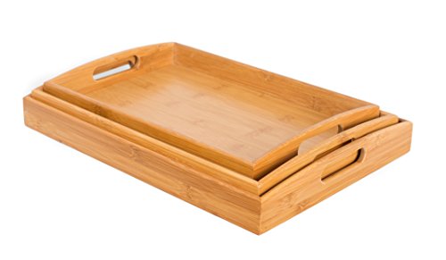 Studio : BirdRock Home Publisher : BirdRock Home Product Description The BirdRock Home Bamboo 3 pc Bamboo Bed Tray are the perfect set of trays for eating breakfast in bed. The trays cut out handles make it easy to carry from the kitchen to the bedroom. Made from sustainable bamboo making it friendly to the environment. Dimensions: Large Tray: 15.75" x 2" x 10.25". Weight: 1.75 lbs. Medium Tray: 14.25" x 9.8" x 2". Weight: 1.5 lbs. Small Tray: 12.5" x 8" x 2". Weight: 1.25 lbs. 0