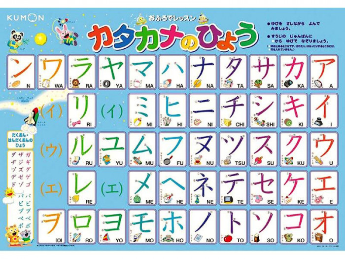 | 水でぬらすだけで、簡単にお風呂の壁にはることができます。「ア」から「ン」の46文字と濁音、半濁音が書かれています。それぞれのカタカナの下には、ローマ字で読み方が記載されています。 |