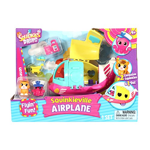 Explore the world of Squinkieville in this oh-so-cute airplane! The roof opens and stairs flip down for hours of sky high play! The teeny-tiny suitcase really opens, and the sweet little tea cart is perfect for a Squinkie's mid-flight snack. Best of all, the airplane comes with two exclusive Squinkies and an exclusive 'Do for them to wear.Feature