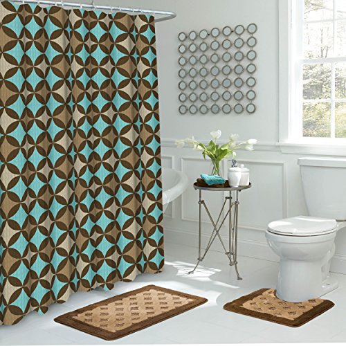 15-piece set includes (1) 72" W x 72" L shower curtain, (1) 18" W x 30 L" bath rug, (1) 18 W" x 17 L" contour rug, and (12) beaded metal shower curtain rings