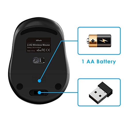 12-month battery life on 1 AA battery (battery NOT included) practically eliminates the need to replace battery. Battery life may vary based on user and computing conditions. Package includes: 1x JETech® 2.4Ghz Wireless Optical Mouse, instruction manual