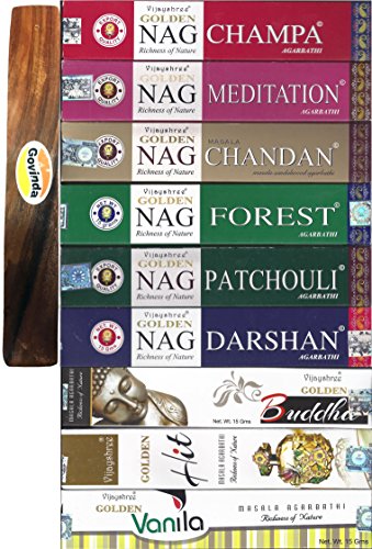 Set of 9 Golden Nag Champa, Nag Meditation, Nag Forest, Nag Chandan, Nag Patchouli, Nag Darshan, Buddha, Hit, and Vanilla with ( Govinda Incense Holder )