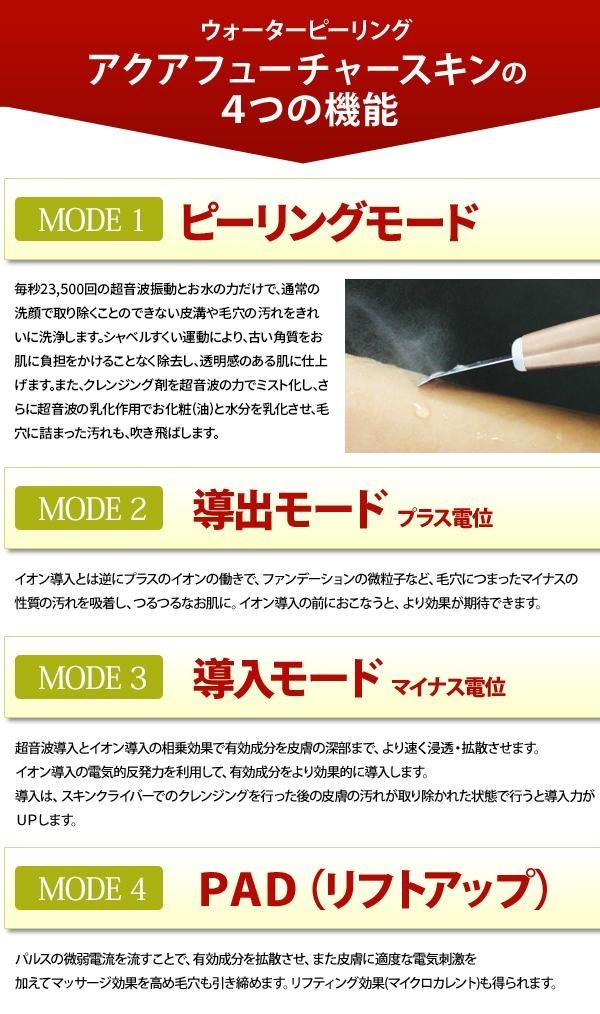 肌を水で濡らして本体をやさしくあてるだけの簡単操作!!ミクロレベルの超音波振動が水を蒸気に還るのと同時に、古い角質や毛穴の汚れを洗い流します。「ピーリングモード」「導出モード(プラス電位)」「導入モード(マイナス電位)」「PAD(リフトアップ)」の4つの機能を搭載。汚れのないつるつるなお肌へと導き、リフティング効果も得られます。 |