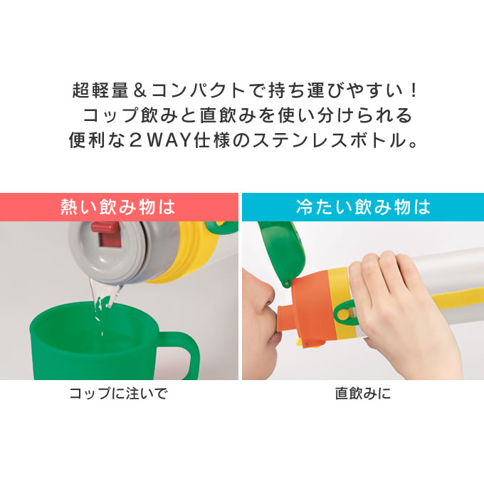 | ポイント | キャップを替えて、直飲みとコップ飲みを使い分けられる2ウェイタイプ! ステンレス製で保温も保冷もできて、1年中使える優れもの♪ コップ飲み使用時の中栓は、スライド式で開閉します。 直飲み使用時は、誤作動でキャップの開閉を防ぐロック機能付きです。 広口タイプで氷が入れやすいです。 お出かけに便利なショルダーベルト付き。 |