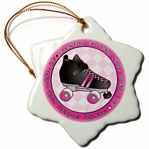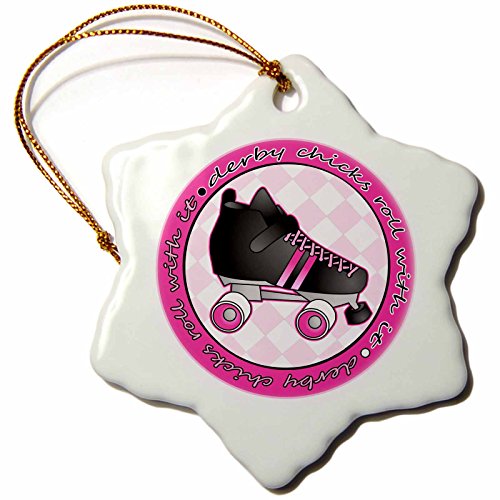 3dRose orn_28508_1 Derby Chicks Roll with it Pink and White with Black Roller Skate Snowflake Decorative Hanging Ornament, Porcelain, 3-Inch