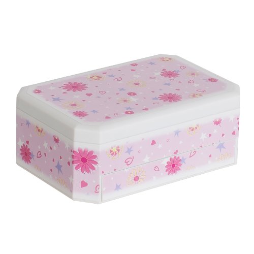 -. Feature : Dimensions: 8.25L x 5.5W x 3.25H in. / Charming flower and heart design / 2 mirrors and ring rolls / Automatic tray and drawer / Ballerina twirls as “Swan Lake” plays