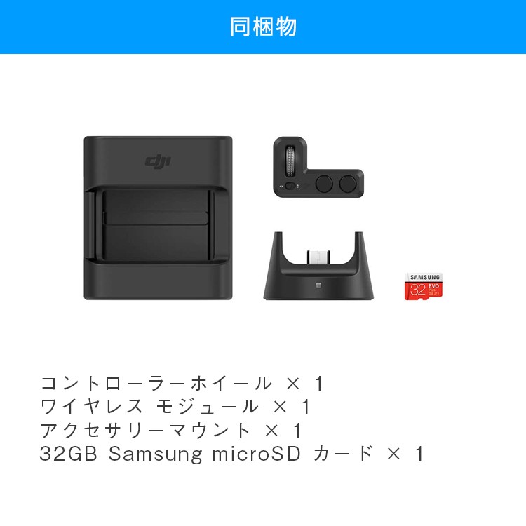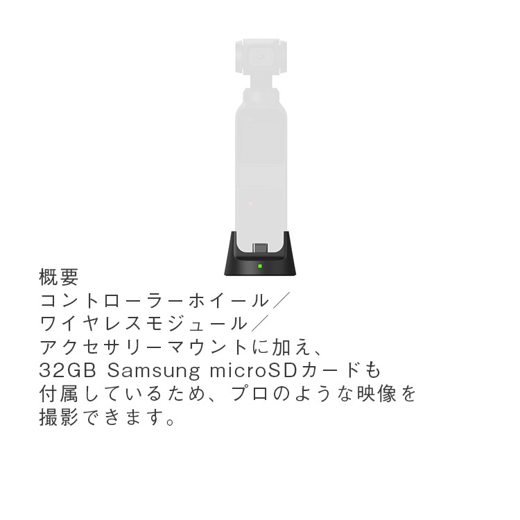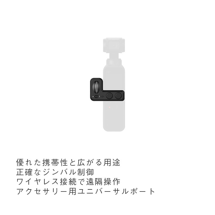 Osmo Pocket オスモポケットとは・・・ DJI史上最小の3軸スタビライザーを搭載する高性能でコンパクトサイズな Osmo Pocketは、 すべてのシーンを輝く瞬間として記録するハンドヘルドカメラです。 主な特徴 ・携帯しやすい軽量設計 ・4K 60fps ・メカニカルジンバルスタビライザー ・インテリジェントな撮影機能 ・様々なアクセサリー ・最大稼働時間 140分 ■本製品の説明 概要 コントローラーホイール/ワイヤレスモジュール/ アクセサリーマウントに加え、 32GB Samsung microSDカードも付属しているため、 プロのような映像を撮影できます。 ハイライト 優れた携帯性と広がる用途 正確なジンバル制御 ワイヤレス接続で遠隔操作 アクセサリー用ユニバーサルポート 同梱物 コントローラーホイール × 1 ワイヤレス モジュール × 1 アクセサリーマウント × 1 32GB Samsung microSD カード × 1 互換性 Osmo Pocket 【その他アクセサリーの紹介】 ・充電ケース 充電ケースは、microSDカード2枚/NDフィルター4枚/スマートフォンコネクター2個の 収納スペースを備え、Osmo Pocketを充電できます。 ・ワイヤレス モジュール Osmo Pocketとスマートフォン間を、BluetoothもしくはWi-Fiで接続し、 シームレスな遠隔操作と伝送を実現します。 ・コントローラーホイール パン&チルトの正確な制御ができるダイヤルと、2つの操作ボタンを搭載し、 撮影の構図をより自由に設定できます。 ・クイックリリース ベース ツイストロック式デザインを採用し、アクセサリーマウントに取り付けます。 工業用接着テープで、ヘルメットやボード、その他の平らな面にしっかりと固定できます。 N・Dフィルターセット センサーに入る光量を低減し、様々な照明条件下でカメラ設定を制御できます。 ・3.5mm アダプター 専用の外部マイクを取り付け、さまざまな場所で音質を最大限に改善します。 ・スマートフォン アダプター スマートフォンアダプタ(Lightning、USB-C)を使用すると、お使いのスマートフォンと Osmo Pocketを接続。DJI Mimoアプリを使用して、より快適に操作できます。 ・防水ケース Osmo Pocketを防水ケースに入れると、水深60 mまでスムーズな映像撮影が可能に。 潜ってクローズアップ撮影したり、低照度環境下でもクリアな映像を撮影したりできます。 ・カバー Osmo Pocketをしっかりと保護し、外出先や移動中でも安全に保管できます。 |