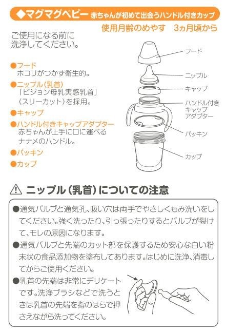 | 素材・材質 | カップ:ポリプロピレン、水添型スチレンイソプレン共重合樹脂 ハンドル付キャップアダプター・キャップ・フード:ポリプロピレン ニップル(乳首)・パッキン:シリコーンゴム |