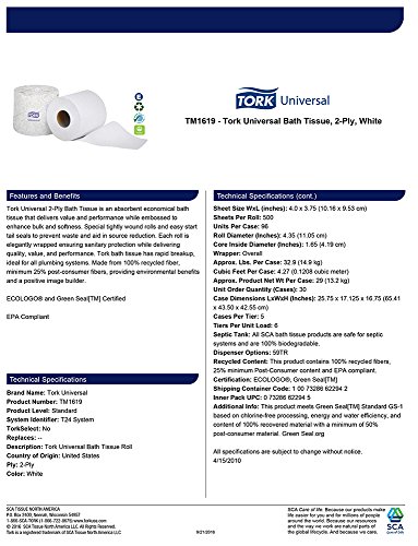 Tork Universal TM1619 Bath Tissue Roll, 2-Ply, 4" Width x 3.75" Length, White, Green Seal Certified (Case of 96 Rolls, 500 Per Roll, 48,000 Sheets)
