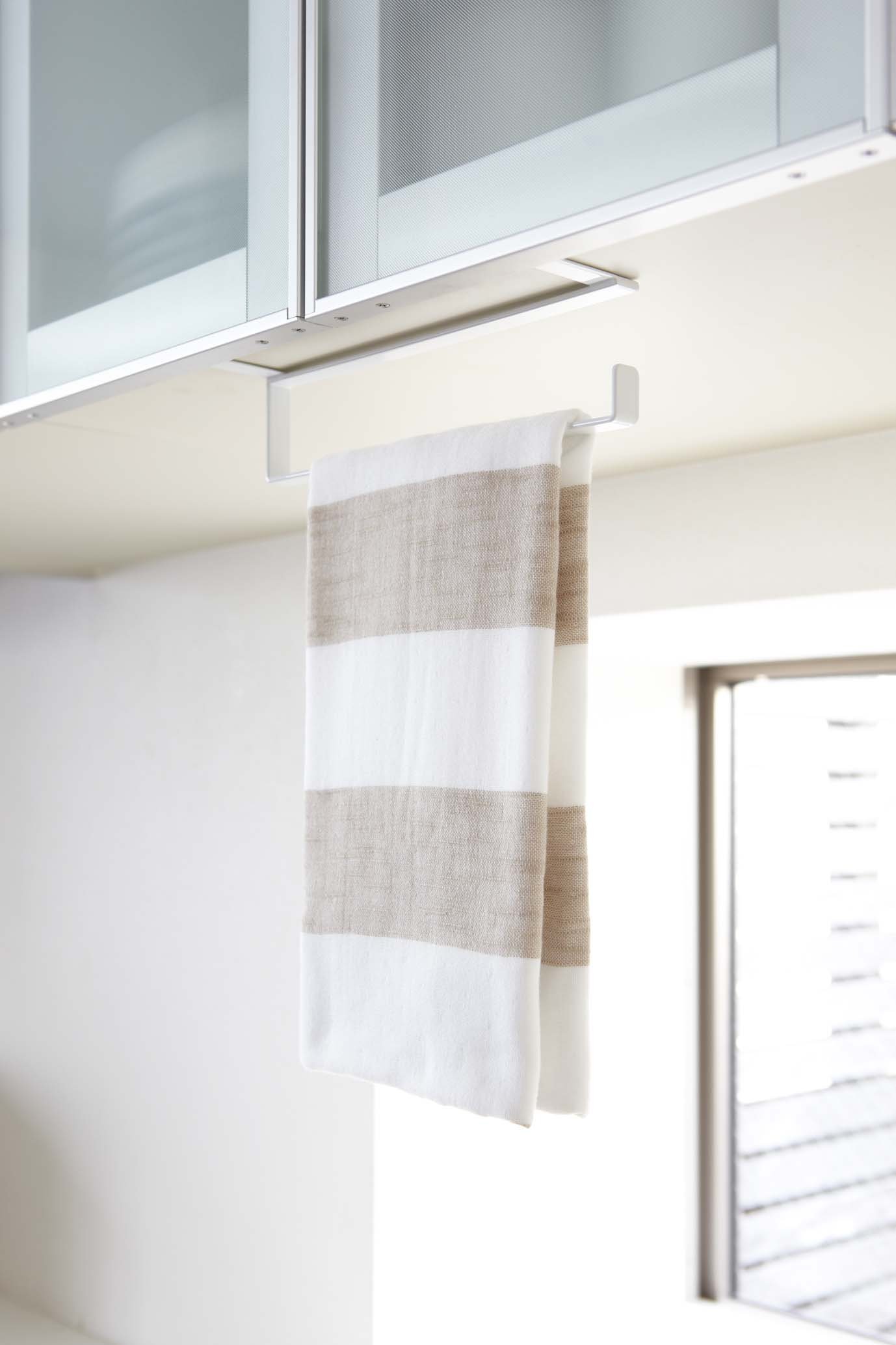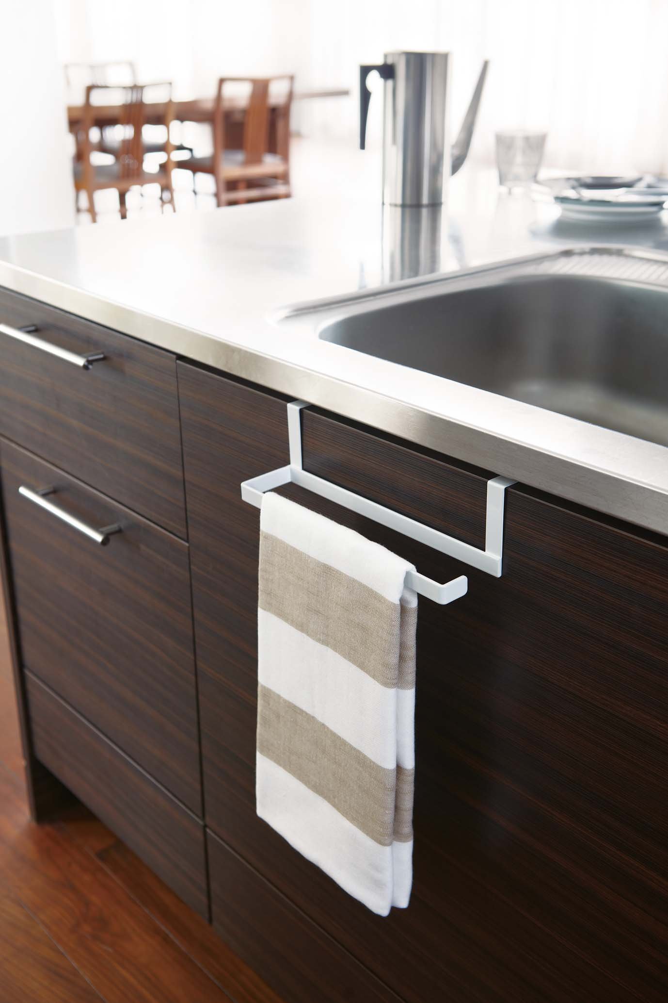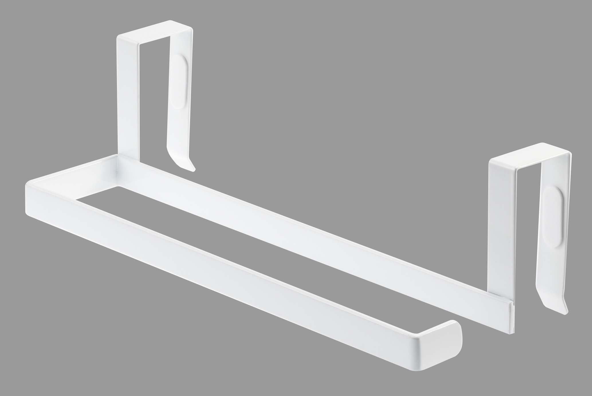 It can be installed in either a hanging cabinet or a kitchen door under the sink, and it can be used as a kitchen paper holder or as a towel hanger.
