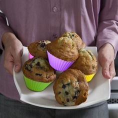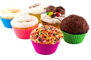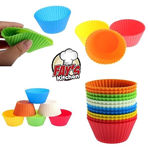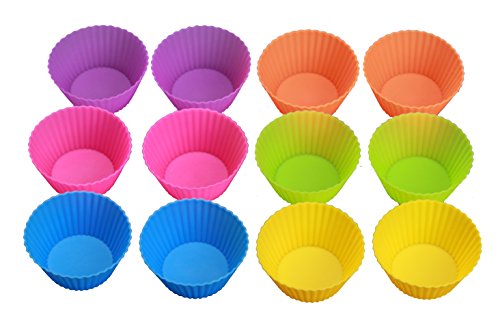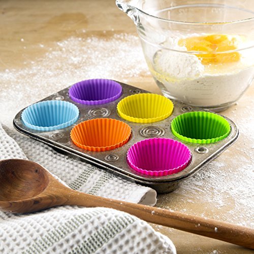 Silicone Baking Cups - Set of 12 Reusable Muffin and Cupcake Liners - Nonstick Cake Molds - With Red, Yellow, Green, Blue, Purple & Pink Fluted Wrappers