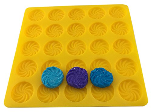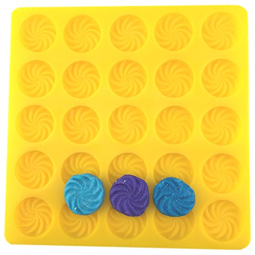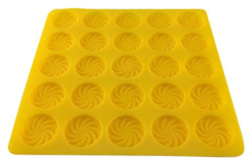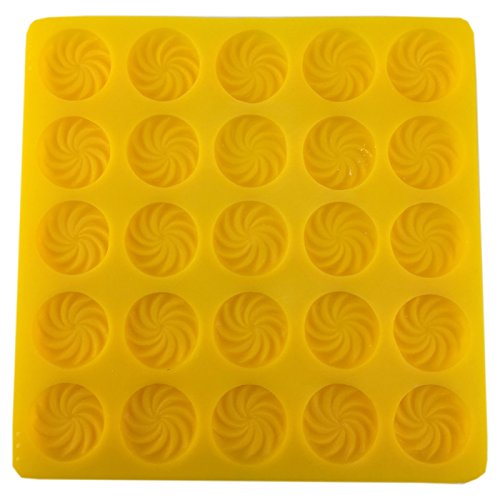 - Swirl Soft Candy Mold: 25 Cavities per mold, 1 Design, Mold Size: 7 ¾” x 7 ¾”, Cavity Size: 1 ¼” Diameter x ¼” Depth