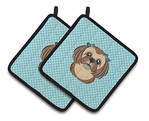 Caroline's Treasures Checkerboard Blue Chocolate Brown Shih Tzu Pair of Pot Holders BB1187PTHD, 7.5HX7.5W, Multicolor