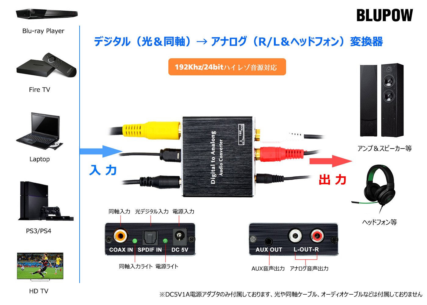 ● It is a DA converter that converts digital optical or coaxial audio signals to analog L / R or 3.5 mm mini-jack stereo audio signals