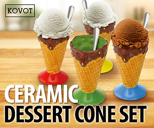 KOVOT Ceramic Dessert & Ice Cream Cone Set - Includes 4 Ceramic Cones And 4 Metal Spoons