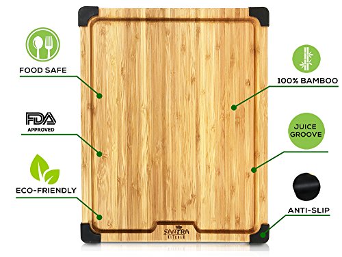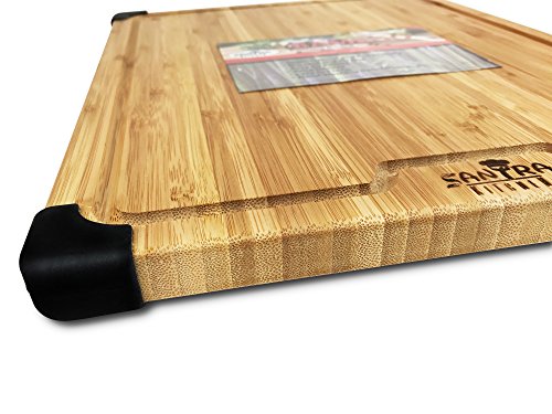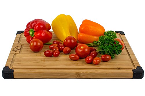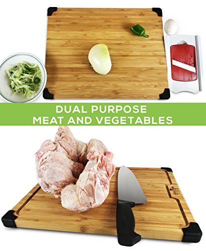 PRACTICAL & MULTIPURPOSE CHOPPING BOARD: Our dual purpose bamboo board can be used for chopping as well as serving. The edges are rounded and covered with anti-skid silicone rubber. Cutting side has a deep groove to prevent juices from spilling. Flip side is plain and ideal for serving finger food.