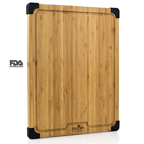 LARGE SIZE 100% NATURAL BAMBOO CUTTING BOARD: Large chopping board 16 x 12 inch size is made with natural bamboo. FDA approved certified food grade it is ideal for cutting meat, vegetables, chopping and mincing herbs, carving roasts and prepping food. It contains no harmful chemicals or glues.