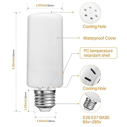 - Led flame bulbs information: base type is E26/27, 50/60HZ, retardant material, Wattage: 1.8W, Voltage: 100V-240V, Color Temperature: 1900-2200K, Lamp lifespan: 50000hours, it will please and enliven the whole site by creating a warm, enthusiastic and passionate atmosphere, definitely a must-have.
