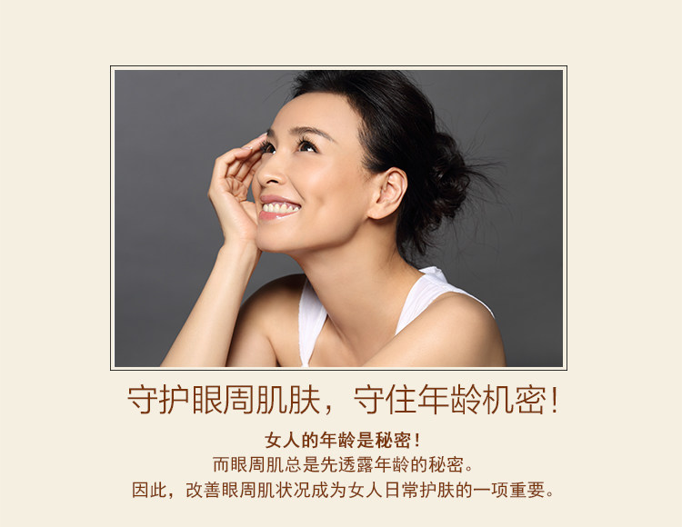 产品功效: 改善眼周皮肤的紧致度、抚平细纹、淡化黑眼圈,消除眼袋、改