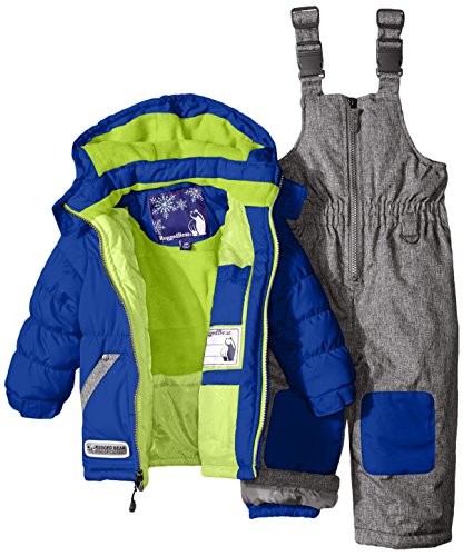 Two piece snowsuit set. Polar fleece lined jacket with solid snow bib with patch details on knee.