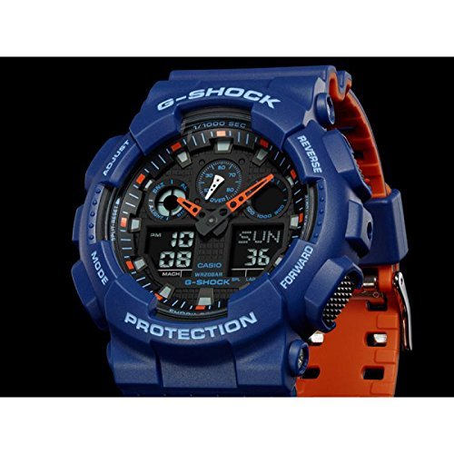 Brand, Seller, or Collection Name:Casio Model number:GA-100L-2AER Part Number:GA-100L-2AER Model Year:2016 Item Shape:Round Dial window material type:Mineral Display Type:Analog Clasp:Buckle Case diameter:5.5 centimeters Case Thickness:17 millimeters Band Material:Plastic Band length:men Band width:18 millimeters Band Color:Blue Dial color:Grey Bezel material:Resin Calendar:Day, date, and month Special features:Chronograph Item weight:2.56 Ounces Movement:Quartz Water resistant depth:200 Meters
