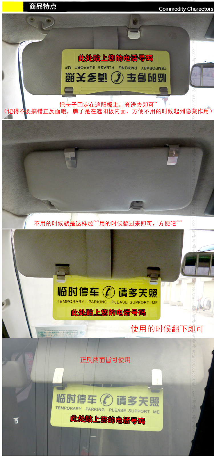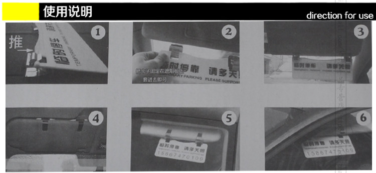 使用方法:临时停车时翻开遮阳板即可,不用时折回去就好,不占空间