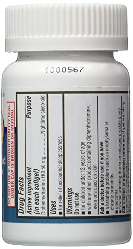 - Feature : Compare to Maximum Strength Unisom SleepGels Active Ingredient. / Nighttime Softgels. / Diphenhydramine HCl, 50 mg. / 96 Softgels.