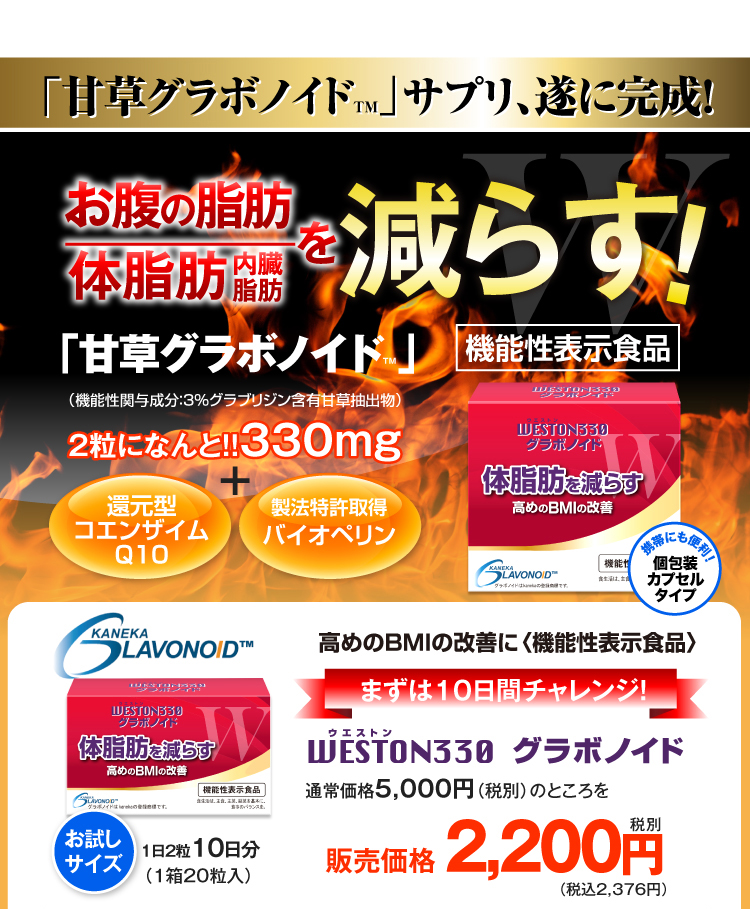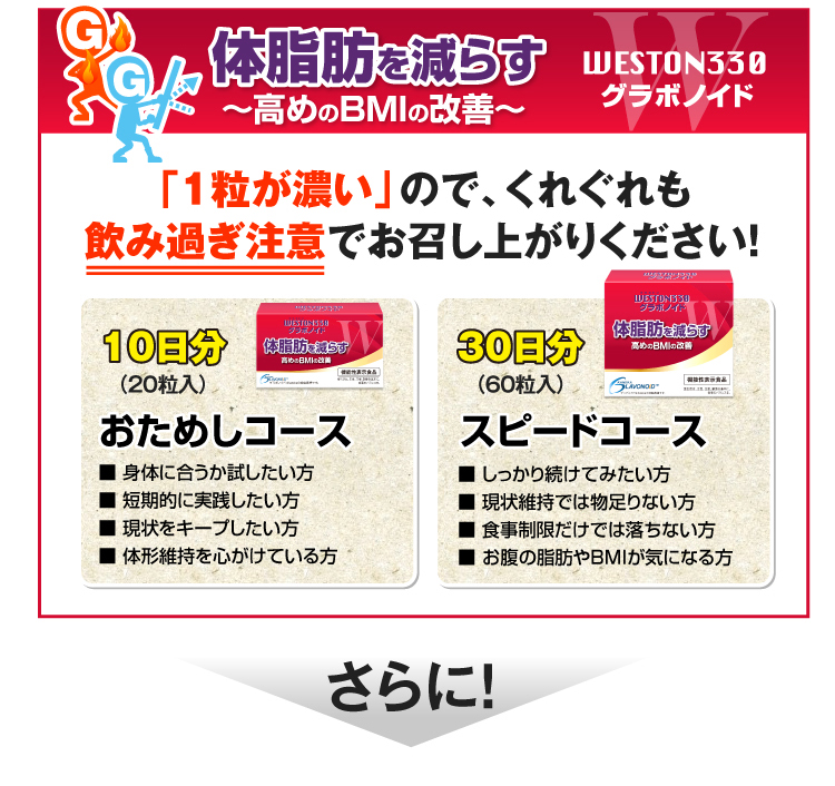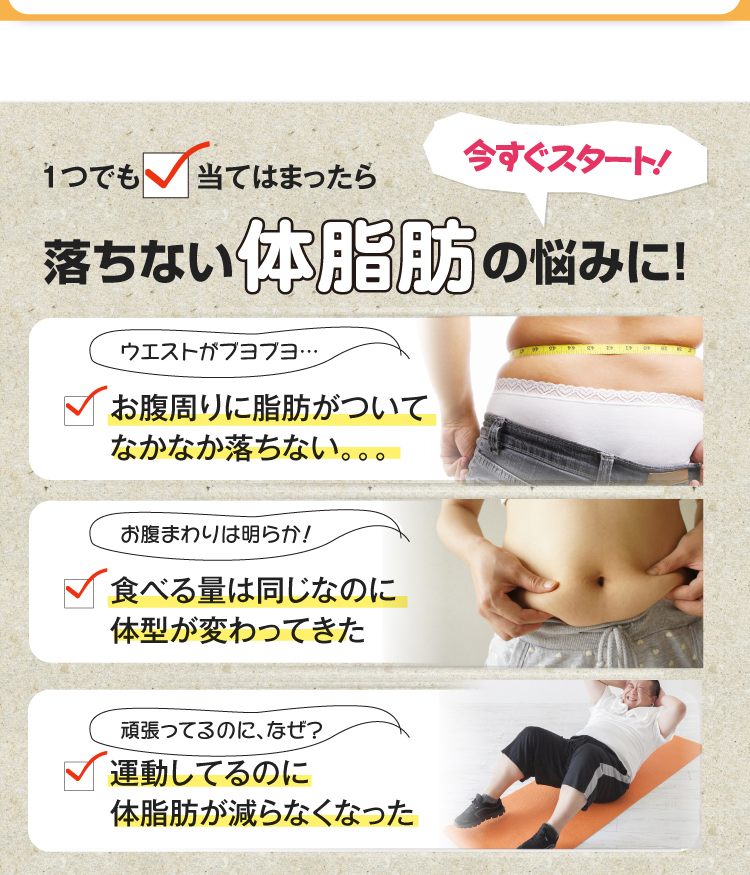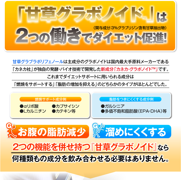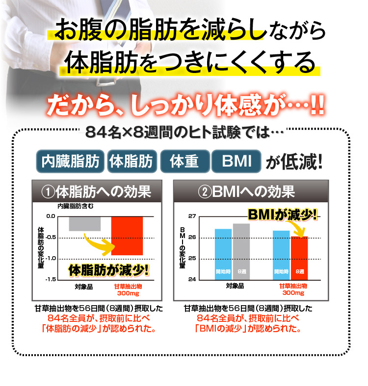 本品は甘草由来グラブリジンを含みます。 甘草由来グラブリジンは、お腹の脂肪(内臓脂肪)・体脂肪を減らす働きがあり、高めのBMIの改善に役立つことが報告されています。体脂肪が気になる方、肥満気味の方に適しています。