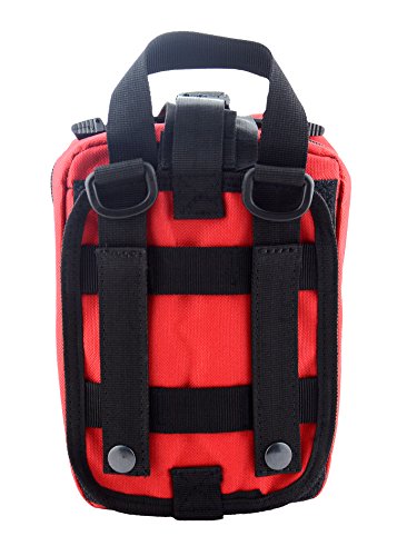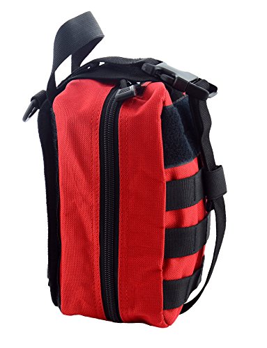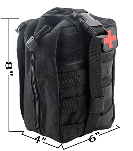-. Feature : Water-Resistant nylon material,durable and comfortabl / MOLLE system, can be attached to any MOLLE compatible gear,like belt,tactical vest and other molle equipment. / Multi Purpose:It has multiple pockets and elastic holders for storage.It is very easy to put goods in and take out. Perfect for carrying medical supplies. / Easy to use:The medical pouch has Double zipper with silent cord pulls and it will open all the way flat so it won't snap shut while you are trying to access first aid supplies. / Dimensions: 8"H X 6"W X 4"D. NOTE: Bag only and empty, didn't include medical supplies.