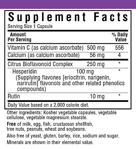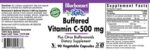 Bluebonnet's Buffered Vitamin C caplets provide vitamin C from calcium ascorbate and citrus bioflavonoids from fresh oranges, lemons, tangerines, grapefruit and limes, plus hesperidin and rutin. Available in easy-to-swallow vegetable capsules for maximum assimilation and absorption. Vitamin C helps tissue and bone grow and repair themselves. It can also help the body absorb the mineral iron. Vitamin C can also help protect against heart disease, prevent scurvy, and decrease total and LDL cholesterol and triglycerides.Feature